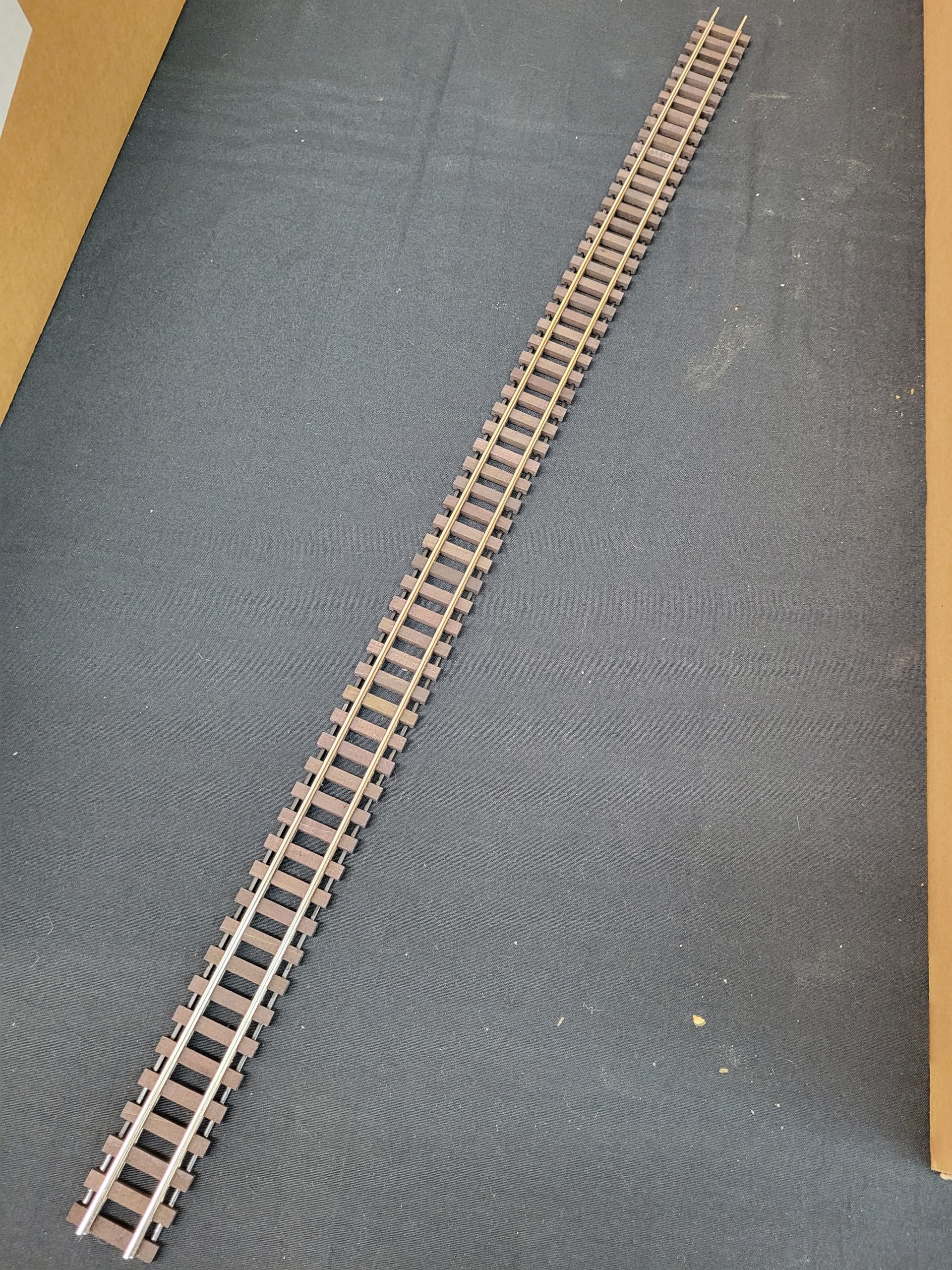 37″ S Gauge tinplate track with wooden ties and metal retaining rods along the rails to keep them straight