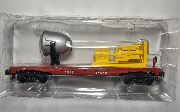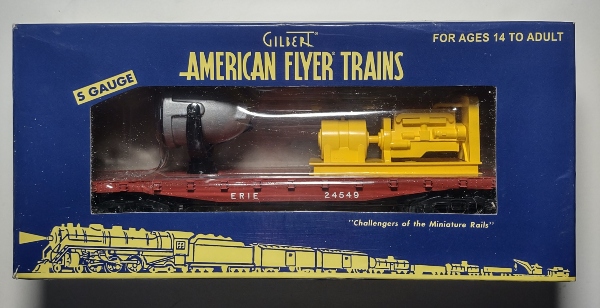 American Flyer 6-49053 Searchlight Flat Car was part of the Defender Set 6-49624 from 2010 Lionel Catalog.  Car was purchased by us from a collection, but appears to be brand new in box, with no signs of wear on the trucks.  Box shows some normal wear and tear.